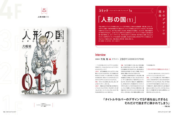 月刊MdN7月号は「ベストセラー本、そのデザインの理由」と題した特集を展開。ヒットを記録した本に施された“読者を誘う工夫”を、デザイナーや編集者の言葉から探っていく内容になっている。「人形の国」の紹介には、著者である弐瓶自身とデザインを務めた2BOY(ASOBISYSTEM)が登場。本作を、従来の作品よりもエンターテイメント性の高い物語にしたいと考えていた弐瓶は「どの層が見ても『自分とは関係ない』と思われないようにしたかった」とデザインコンセプトを語り、現在のバージョンにたどり着くまでに作られたタイトルロゴの別案も掲載された。