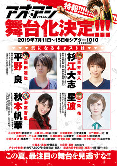 舞台では主人公の青井葦人役を杉江大志、福田達也役を平野良、一条花役を星波、海堂杏里役をTEAM SHACHIの秋本帆華がWキャストとして演じる。杉江は「『アオアシ』は僕の大好きなマンガです!その舞台化に主人公で出演出来ることを心から嬉しく思います」と喜びを語るとともに、「彼の直向きさと、サッカーへの献身、何よりサッカーを愛する心を大切に演じたいと思います。作品のいちファンとして、素敵な舞台に出来るよう精一杯努めます!」と意気込んだ。