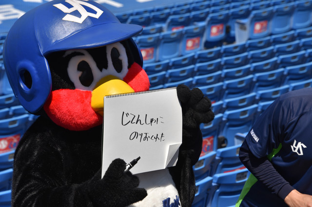 単行本発売のたびに行われてきた、つば九郎による「お手羽渡し会」。東京ヤクルトスワローズOfficial Goods Shopつば九郎店で単行本を購入した先着100名のファンが待ち構える中、神宮球場内のスタンドにつば九郎が姿を現した。まずはつば九郎がスケッチブックを取り出し「へいじつなのにひまだね」と平日のお昼に集まったファンたちに先制攻撃。さらに「さぼったひと」と続け笑いを誘う。