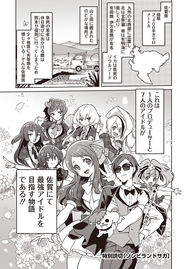 特集では作品紹介にはじまり、源さくら役の本渡楓、紺野純子役の河瀬茉希、星川リリィ役の田中美海の撮り下ろしグラビアや自身の“サガ(性)”などについて語ったインタビュー、Cygamesの竹中信広プロデューサーとMAPPAの大塚学代表取締役の対談、境宗久監督のインタビューなどを掲載。また南北による読み切りマンガや、去る3月17日に東京・品川インターシティホールで開催されたライブイベント「ゾンビランドサガLIVE~フランシュシュみんなでおらぼう!~」のレポートも掲載されている。さらにキャラクターデザインを手がけた深川可純の描き下ろしイラストと本渡、河瀬、田中のグラビアを使ったリバーシブルポスターも付属するなど盛りだくさんの内容だ。