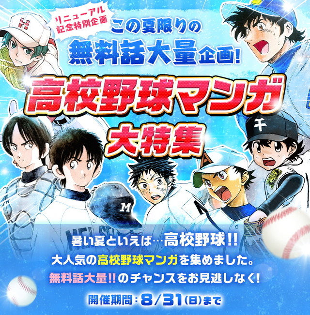 無料開放の対象となっているのは、満田拓也「MAJOR」、あだち充「MIX」、田中モトユキ「最強!あおい坂高校野球部」、寒川一之「最後は?ストレート!!」、福井あしび「アノナツ-1959-」、伊藤しろ「夏空エンドラン」の6タイトル。開催期間は8月31日までとなっている。