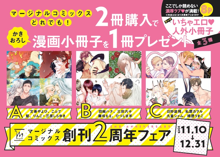 人外BL・マージナルコミックス2周年、文善やよひ・私屋カヲルらの小冊子配布