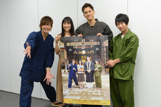 囲み取材の様子。左から田村侑久、谷村美月、水野勝、清水天規。 (c)2017「サチのお寺ごはん」製作委員会