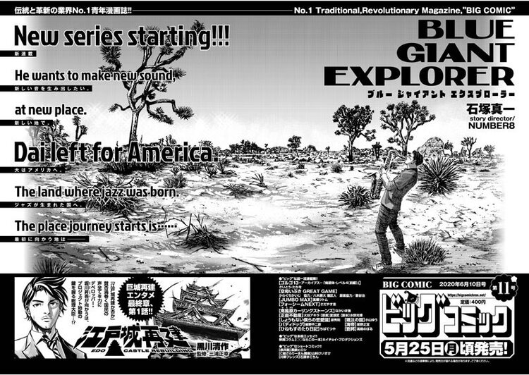 世界一のジャズプレーヤーを目指す青年・宮本大を描く「BLUE GIANT」シリーズ。4月に発売されたビッグコミック9号にて大は新たな音楽を生み出すためカルテットを解散し、ヨーロッパ編は完結を迎えた。「BLUE GIANT EXPLORER」では、大がジャズが生まれた国・アメリカの地へ降り立つ。