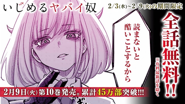 「いじめるヤバイ奴」は、クラスに君臨する“いじめっ子”の仲島達也と、儚げな女子生徒・白咲花の関係を描く作品。白咲さんに対し暴虐の限りを尽くしているかに見えた仲島だったが、彼は白咲さんにいじめを強要されていて……。今回の無料公開は、2月9日に最新10巻が発売されることを記念したものだ。