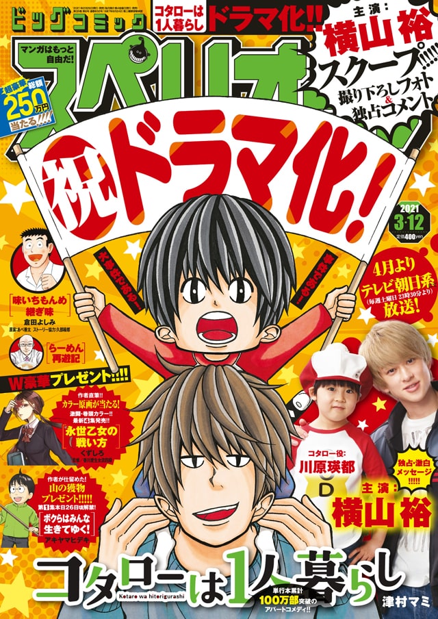 本日2月26日発売のビッグコミックスペリオール6号(小学館)は、先日ドラマ化が発表された津村マミ「コタローは1人暮らし」が表紙を飾った。ドラマで狩野進役を演じる横山裕(関ジャニ∞)、さとうコタロー役を演じる川原瑛都も登場している。