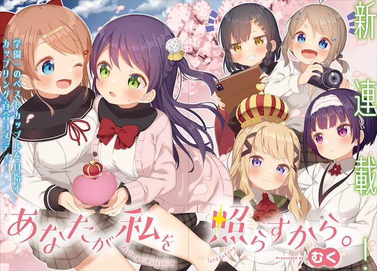 「あなたが私を照らすから。」は、「今日も女の子を攻略した。」のむくによる新作。舞台となる女子校・私立桜葉学園では、毎年“学園一のカップル”を決める行事が催されており、そこで優勝したカップルは生徒会長と副会長に任命され、その後も幸せと成功に満ちた人生を歩むと言われていた。物語はそんな桜葉学園に、運命の人との出会いを夢見る少女・暁恵が入学したことから始まる。