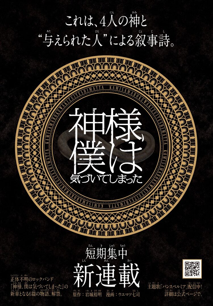 ロックバンド・神様、僕は気づいてしまったの新プロジェクトの一貫として、本日6月11日発売のゲッサン7月号(小学館)では「神様、僕は気づいてしまった」と題した短期集中連載が開幕した。マンガはウエマツ七司が手がけている。