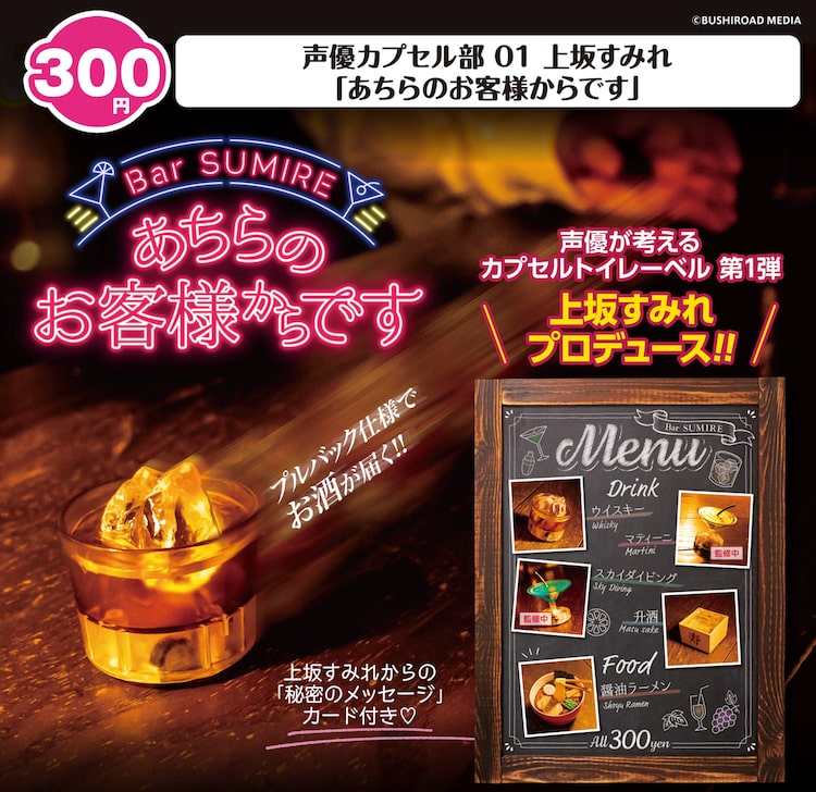 「声優カプセル部」はブシロードメディアの展開するカプセルトイレーベル。上坂が実際に打ち合せを重ね、ラフを描くなどこだわって考案した「あちらのお客様からです」ではウイスキー、カクテル、升酒といった酒4種と、酒の締めに食べたいラーメン1種の全5種がラインナップされた。いずれもプルバック仕様で走り、バーなどでカウンター伝いにお酒をおごる憧れのシチュエーションを再現できるアイテムだ。なおカプセルには上坂の複製メッセージが入った、“秘密のメッセージカード”がランダムで封入される。価格は1回税込300円。商品は全国のカプセルトイ売り場にて取り扱われる。