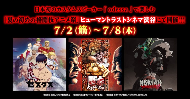 「夏の初めの格闘技アニメ祭」と題されたこのイベント。高域と低域の音を同じ箇所から出力することにより、近距離にも正確な音を届けられるミニシアター向けのカスタムスピーカー「odessa(オデッサ)」を使って上映は行われる。さらに7月4日には「NOMAD メガロボクス2」のスタッフトークショー、8日にはアニメ「バキ」シリーズで範馬刃牙役を務める島崎信長と原作である「刃牙」シリーズの元編集担当・横井佑来氏のトークショーを実施。チケットは各上映日2日前の0時よりヒューマントラストシネマ渋谷の公式サイトで販売され、残席がある場合は劇場窓口でも取り扱われる。詳細は公式サイトを確認しよう。