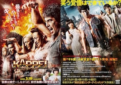 チラシの表面には、爆発をバックにした筋骨隆々な男たちの姿がずらり。素肌にデニムベストの勝平を筆頭に、山本耕史演じる特攻服にリーゼントの正義、大貫勇輔演じる裸にサスペンダーの守、小澤征悦演じる逆立った髪の毛をした英雄ら“終末の戦士”たちと、古田新太演じる無戒殺風拳の師範が、鬼気迫る表情で立ち並んでいる。なお右下にはインパクトの強い5人とは対象的に、清楚な服に身を包んだ山瀬ハルと西畑大吾(なにわ男子)演じる入間啓太の姿がデザインされている。一方裏面には、荒廃した世紀末感あふれる街を堂々と歩く勝平を筆頭に各キャラクターを配置。伊藤英明の肉体美が光るビジュアルとなった。このビジュアルは、本日11月19日より全国の劇場に掲出されている。「KAPPEI カッペイ」は2022年3月18日ロードショー。