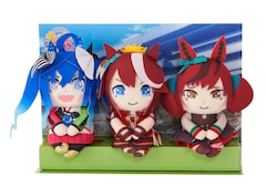 「ちょっこりさん」はちょこんと座ったポーズが特徴のぬいぐるみシリーズ。座らせて飾れるだけでなく、小物を持たせたり、フォトフレームに引っかけたりすることができる。ぬいぐるみはトウカイテイオー、ナイスネイチャ、ツインターボ、メジロマックイーン、ミホノブルボン、ライスシャワー、スペシャルウィーク、サイレンススズカ、ゴールドシップの全9種をラインナップ。3種ずつをセットにした3つのセットでお目見えした。それぞれのセットには、着脱可能な小物パーツ・にんじんが付属。パッケージにはウマ娘たちが走るレース場と、レース後に行われるウイニングライブのステージが描かれており、そのまま背景として飾っても楽しめる。
