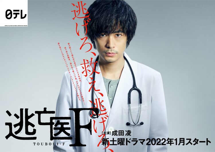 「逃亡医F」は、研究医で同僚でもある恋人を殺したという濡れ衣を着せられ、指名手配犯となった天才外科医・藤木圭介を描く医療サスペンス。藤木は、「鳴海健介」と名を偽り、恋人の死の真相を突き止めるため逃亡を続けることとなる。ティザービジュアルには白衣を着た成田凌演じる藤木の姿が。無精ひげに無造作なヘアスタイルで、じっと前を見つめる力強い眼差しが印象的なこのビジュアルには、「逃げろ、救え、逃げろ、」と藤木に降りかかる運命を予感させるコピーも入れられた。ドラマは2022年1月に日本テレビ系にて放送開始。