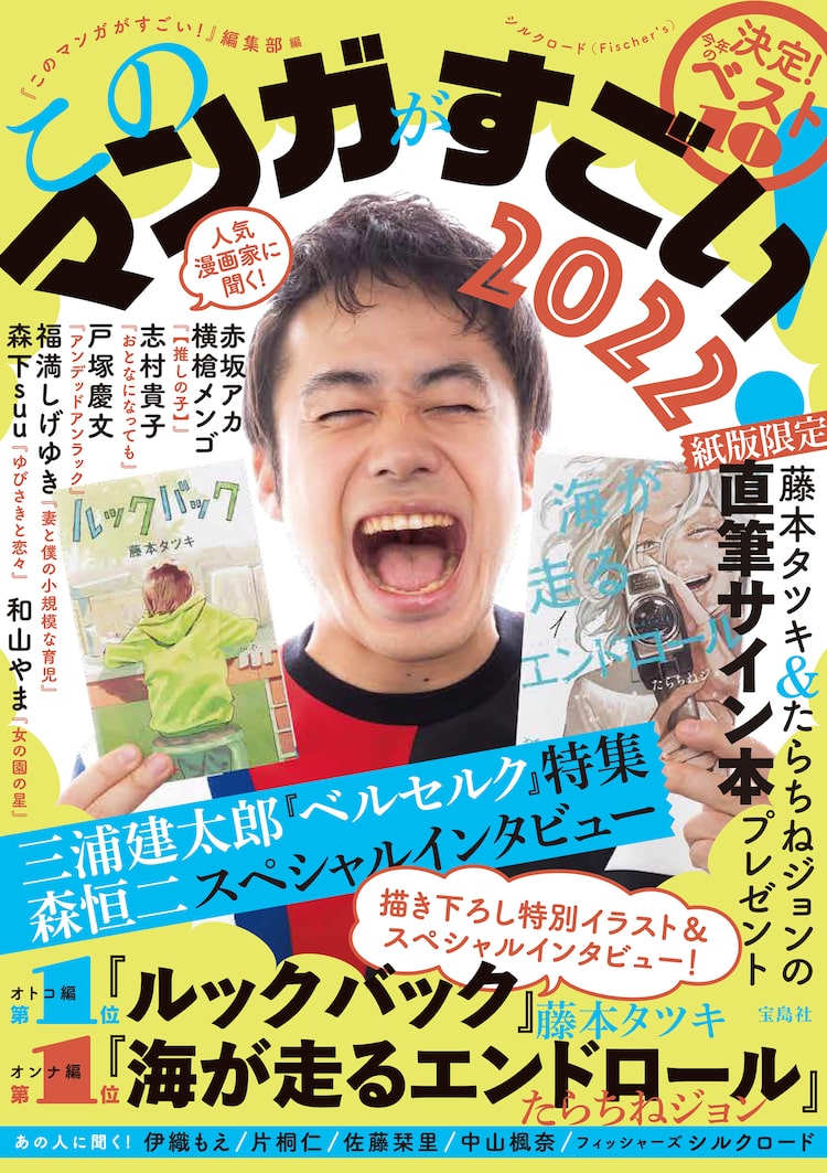 宝島社が毎年発行しているマンガ紹介本の最新版「このマンガがすごい!2022」が、12月9日に発売される。そのオトコ編1位が藤本タツキ「ルックバック」、オンナ編1位がたらちねジョン「海が走るエンドロール」と発表された。