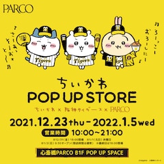 ナガノ「ちいかわ」と阪神タイガースのコラボグッズ「ちいかわ×阪神タイガース×心斎橋PARCO」が、大阪・心斎橋PARCO B1Fの期間限定ショップ「ちいかわ POP UP STORE」およびPARCO ONLINE STOREで販売される。