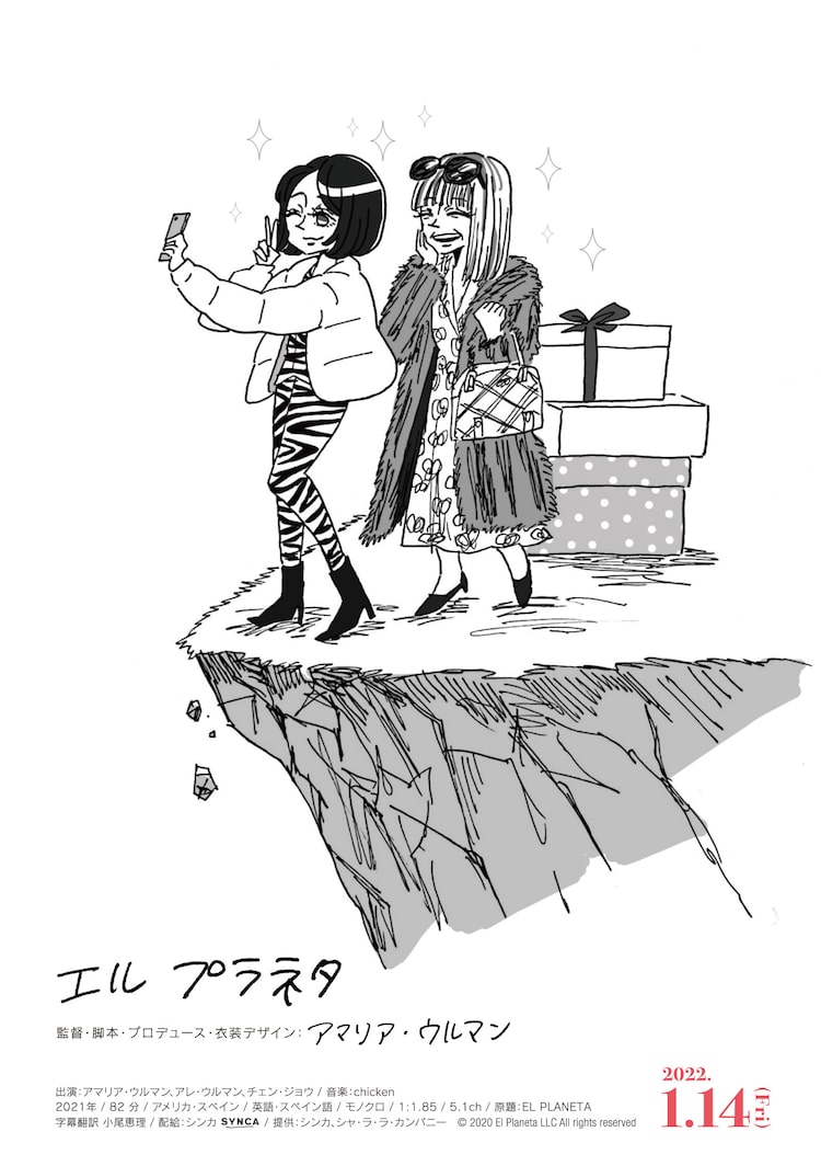 2022年1月14日に公開される「エル プラネタ」。ロンドンでの学校生活を終えた駆け出しスタイリスト・レオが、生まれ故郷であるスペインの田舎町に帰ってくるところから物語は始まる。破産寸前になっていた母親マリアと崖っぷちの状況に追い込まれながらもSNS映えするスタイリッシュな暮らしを目指していたある日、レオはチープな雑貨屋でイケメン店員と出会い……。世紀末のイラストには、文字通りの崖っぷちに立って自撮りをしているレオとマリアの母娘が描かれた。また「日本版イラストビジュアル」はもう1種類公開されており、こちらはイラストレーターのWALNUTが手がけている。