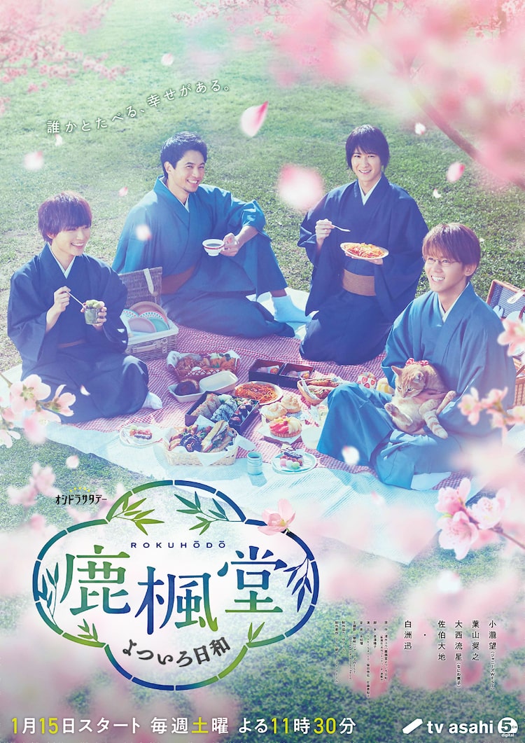 2022年1月15日よりテレビ朝日系24局の「オシドラサタデー」枠で放送される「鹿楓堂よついろ日和」。ポスタービジュアルには着物に身を包んだ、小瀧望(ジャニーズWEST)扮する東極京水、葉山奨之扮する永江ときたか、大西流星(なにわ男子)扮する中尾椿、佐伯大地扮するグレゴーリオ・ヴァレンティノの鹿楓堂メンバー4人がお目見えした。