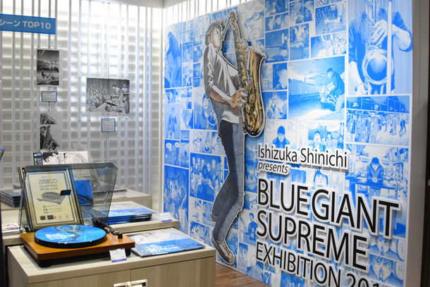場内には「BLUE GIANT SUPREME」の原画を多数展示。「読者が選ぶ名シーンTOP10」と題されたコーナーには、選ばれた場面の原画に加え、各シーンを選んだ読者からのコメントも掲示された。劇中に登場する楽曲を該当シーンとともに紹介するスペースや、高音質の機器で試聴が楽しめるコーナーも設けられ、より深く「BLUE GIANT SUPREME」の世界を味わえる企画が展開されている。