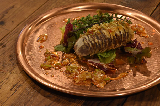 オオグソクムシがまるごと1匹盛り付けられた「オオグソクムシのチリソース和え」は、ぽんとごたんだが「オオグソクムシ、美味しいですよ。僕はすごく好きな食材です」と紹介。見た目のインパクトから恐る恐るという感じで手を伸ばす参加者もいたが、「香ばしい。噛むほどに味が出る」「エビの尻尾みたい。私、これ好きです」と称賛が相次ぐ。お店オリジナルのチリソースも好評だった。