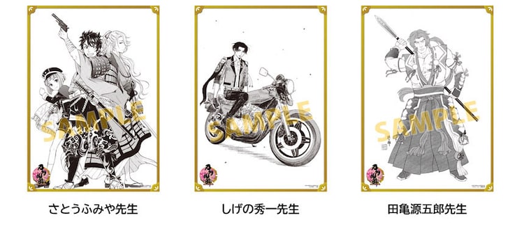 左からさとうふみやが描いた宗三左文字・陸奥守吉行・前田藤四郎(「刀剣乱舞-ONLINE- コミックアンソロジー ~刀剣男士迅雷~」収録)、しげの秀一が描いた豊前江(「刀剣乱舞-ONLINE- コミックアンソロジー ~刀剣男士迅疾~」収録)、田亀源五郎が描いた蜻蛉切(「刀剣乱舞-ONLINE-アンソロジー ~戦場に咲かせる花~」収録)。