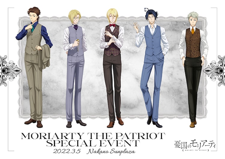 3月5日に東京・中野サンプラザで開催される同イベントは、ウィリアム・ジェームズ・モリアーティ役の斉藤壮馬、アルバート・ジェームズ・モリアーティ役の佐藤拓也、ルイス・ジェームズ・モリアーティ役の小林千晃、シャーロック・ホームズ役の古川慎、ジョン・H・ワトソン役の小野友樹が出演するもの。新作OVA「憂国のモリアーティ~百合の追憶~」の先行上映も行われる。