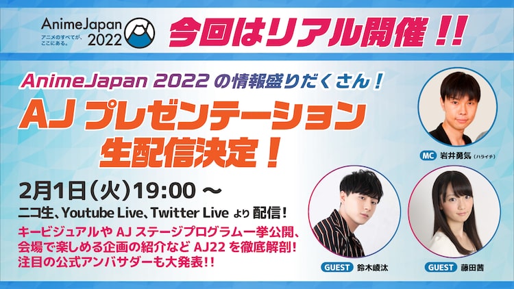 アニメイベント「AnimeJapan 2022」の最新情報を届ける生配信番組「AJプレゼンテーション」が、2月1日19時よりニコニコ生放送、YouTube Live、Twitter Liveで実施される。
