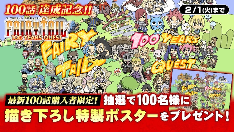 「FAIRY TAIL 100 YEARS QUEST」100話突破記念、描き下ろしポスタープレゼント 2022年1月26日2022年1月26日 editor 「FAIRY TAIL 100 YEARS QUEST」プレゼントバナー真島ヒロ原作による上田敦夫「FAIRY TAIL 100 YEARS QUEST」が100話を突破。これを記念したプレゼントキャンペーンを実施している。 マガジンポケットで連載中の「FAIRY TAIL 100 YEARS QUEST」は、2017年に完結した「FAIRY TAIL」のその後を描く“正統続編”。2月1日までに最新100話を購入した人の中から抽選で100人に、描き下ろしポスターがプレゼントされる。 関連記事「FAIRY TAIL」エクシードのトウカ役は久保ユリカ、第13話で本来の姿に「FAIRY TAIL 100年クエスト」寺嶋裕二からの応援イラスト公開、第1話場面カットも「FAIRY TAIL」炎神竜イグニア役は岡本信彦「楽しんで演じていこうと思います」「FAIRY TAIL 100年クエスト」ナツら集うメインビジュアル 3人の追加キャストも「FAIRY TAIL 100年クエスト」新PV公開、主題歌担当はDa-iCE&僕が見たかった青空「FAIRY TAIL 100年クエスト」キャスト7人からコメント到着、各キャラの新たな姿も Tweet 関連コミック FAIRY TAIL 100 YEARS QUEST FAIRY TAIL FAIRY TAIL ブルー・ミストラル FAIRY TAIL外伝 剣咬の双竜 FAIRY TAIL S FAIRY TAIL ハッピーの大冒険 FAIRY TAIL CITY HERO