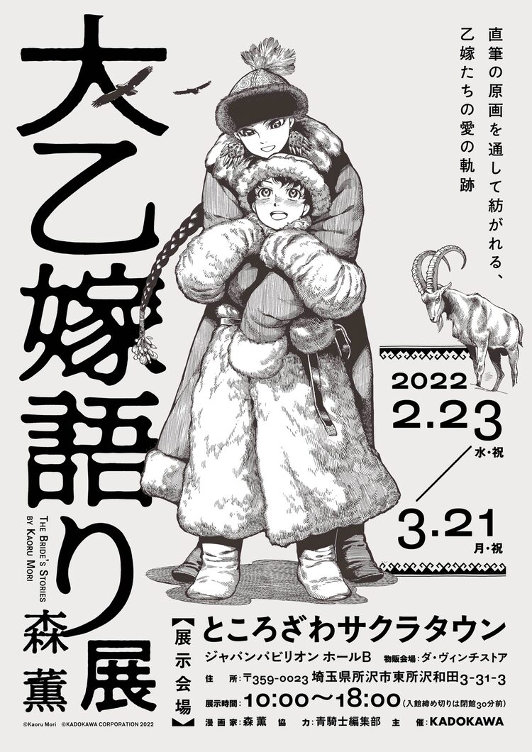 「大乙嫁語り展」では、森直筆のカラー原稿やモノクロ原稿を中心とした100点以上の展示物を用意。生原画を通して、壮大な「乙嫁語り」の世界を堪能できる内容となる。また森の描き下ろしイラストを使用したオリジナルグッズを販売し、中央アジア各国の大使館協力によるイベントも開催。ところざわサクラタウン内のさまざまな施設で連動企画が行われる予定だ。