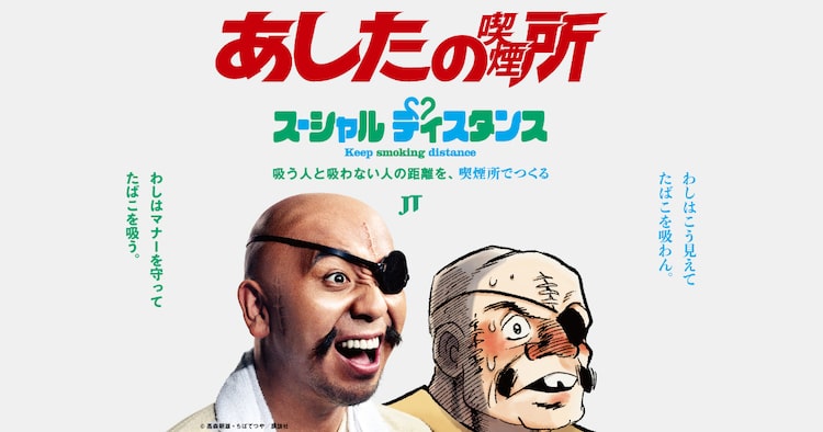 高森朝雄(梶原一騎)原作によるちばてつや「あしたのジョー」の登場人物・丹下段平が、千鳥の大悟とともにJTの「スーシャルディスタンス」キャンペーンのWebCM「あしたの喫煙所」に出演。全6編が本日2月8日にYouTubeチャンネル「スーシャルディスタンスch【JT】」で公開された。