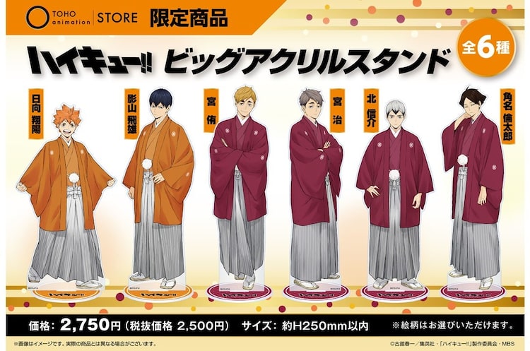 「ビッグアクリルスタンド」は日向翔陽、影山飛雄、宮侑、宮治、北信介、角名倫太郎のものを用意。2021年1月に開催された「ハイキュー!! TO THE TOP」の配信イベント「新春!稲荷崎高校スペシャルチームミーティング~烏野もまだまだ気分は松の内~」のため描き下ろされた和装のイラストを使用している。サイズは20cm超で、価格は税込2750円。発送時期は4月上旬予定となっている。