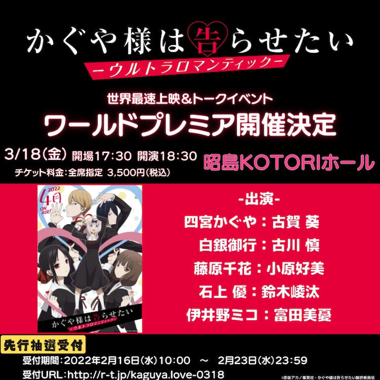 イベントでは4月の放送開始に先がけて「かぐや様は告らせたい-ウルトラロマンティック-」を先行上映するほか、四宮かぐや役の古賀葵、白銀御行役の古川慎、藤原千花役の小原好美、石上優役の鈴木崚汰、伊井野ミコ役の富田美憂のトークも実施。“重大発表”も行われる予定だ。チケットの先行受付は2月16日10時から23日23時59分まで、楽天チケットにて実施。一般発売は3月12日10時にスタートする。