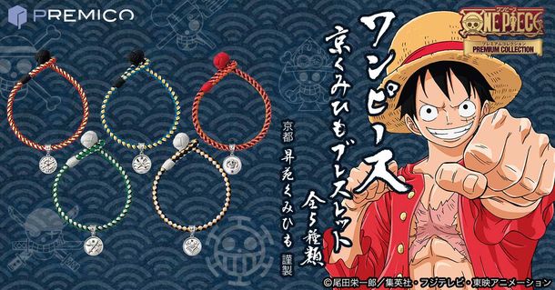 尾田栄一郎原作によるアニメ「ONE PIECE」と、京都の伝統工芸「京くみひも」のコラボによるブレスレット「ワンピース 京くみひもブレスレット」が、PREMICOにて販売されている。
