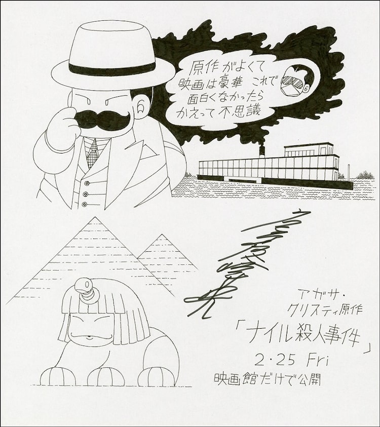 2月25日公開の「ナイル殺人事件」は、“ミステリーの女王”と称されるアガサ・クリスティが1937年に発表した小説「ナイルに死す」が原作。クリスティが描くミステリー作品の大ファンという魔夜は、映画の舞台となったエジプトを背景に、口ひげがトレードマークである主人公の名探偵・ポアロを描いている。また直筆で「原作がよくて映画は豪華。これで面白くなかったらかえって不思議」と映画への期待を込めたメッセージもしたためた。また山田はマンガ形式で、同作の魅力をアピールしている。
