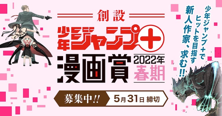 「少年ジャンプ+漫画賞」は、季節ごとに年4回の締切が設けられており、1年間いつでも応募が可能。入選、準入選、佳作の受賞作は少年ジャンプ+に掲載され、賞金も付与される。本日2月21日に2022年春期の募集がスタート。5月31日まで募集を受け付け、2022年春期の結果は8月頃に少年ジャンプ+およびマンガ賞のWebサイトで発表される。
