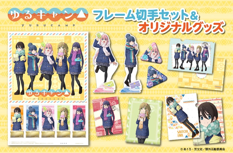 あfろ原作によるTVアニメ「ゆるキャン△」のフレーム切手セットとオリジナルグッズが、郵便局のネットショップで販売されている。