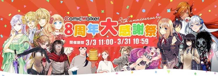 KADOKAWAのWebマンガサイト・ComicWalkerが、本日3月3日より「ComicWalker8周年 大感謝祭」と題したキャンペーンを開催している。