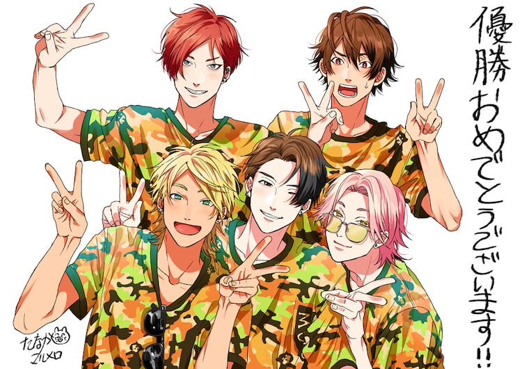 現在TOKYO MX、BS11、MBS、ABEMAほかにて放送・配信中の「フットサルボーイズ!!!!!」。3月6日より放送・配信される第9話のエンドカードには、2021年2月の合同練習試合イベントのDAY MATCHで優勝したことから、桃実高校の描き下ろしイラストが登場することに。イラストは、試合イベントで優勝した際に撮影された桃実高校のキャスト集合写真をもとに描かれる。またたなかマルメロの“優勝お祝いイラスト”は、明るくピースサインをする5人の姿が描かれた。