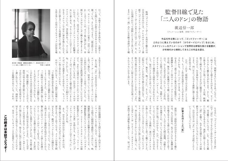 中学時代に初めて「ゴッドファーザー」「ゴッドファーザーPARTII」を鑑賞して以降、幾度となく作品を観直しているという渡辺。「監督目線で見た『二人のドン』の物語」と題したインタビューでは、自身の年齢によって注目するポイントが変わってきたという「ゴッドファーザー」の楽しみ方や自作への影響、同じ監督という立場ゆえに共感できるという「ゴッドファーザー」の監督フランシス・フォード・コッポラが抱える苦悩などをリスペクトを込めて語っているほか、名シーンや演出の分析も行っている。