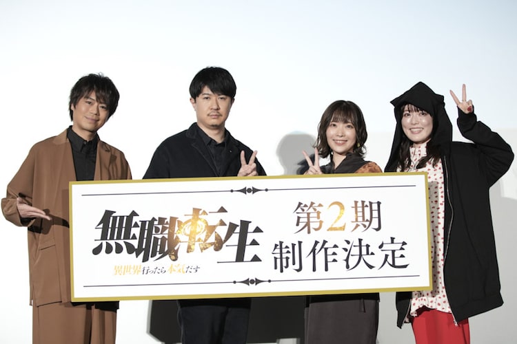 アニメ「無職転生 ~異世界行ったら本気だす~」の舞台挨拶が本日3月6日に東京・TOHOシネマズ日比谷で行われ、ルーデウス役の内山夕実、ルーデウスの前世の男役の杉田智和、エリス役の加隈亜衣、ルイジェルド役の浪川大輔が登壇した。