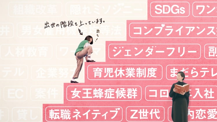 「悪女(わる) ~働くのがカッコ悪いなんて誰が言った?~」は、大手IT企業の超窓際部署に配属されたポンコツだが型破りな会社員・田中麻理鈴が、謎多きクールな先輩社員・峰岸雪の助言を武器に、会社の最下層から、ステップアップを目指していく物語。ティザーCMでは出世の階段を上っていくという作品の内容になぞらえて、今田美桜演じる麻理鈴が文字通りの階段をよじ上っていく。階段にはドラマに関係する「ジェンダーフリー」「育児休業制度」「転職ネイティブ」といった現代の労働にまつわるキーワードなどが書かれている。