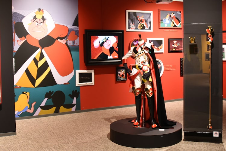 「ディズニー ツイステッドワンダーランド展|ヴィランズから生まれた世界」ハーツラビュル寮の展示の様子。