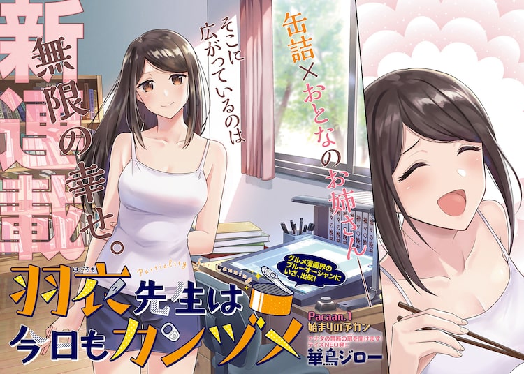 「羽衣先生は今日もカンヅメ」は、グルメマンガで一世を風靡したマンガ家・羽衣青葉と、彼女のアシスタントをすることになった男子大学生・稲葉ニチローを描くラブコメディ。大学教授から紹介され、羽衣のもとを訪れた稲葉だが、彼女は重度の“缶詰偏愛者”で……。