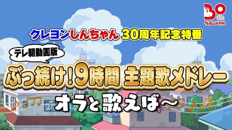 臼井儀人原作によるアニメ「クレヨンしんちゃん」の特番「クレヨンしんちゃん 30周年記念特番 テレ朝動画版 ぶっ続け!9時間主題歌メドレー~オラと歌えば~」が、 3月26日12時よりテレビ朝日の動画配信サービス・テレ朝動画で配信される。