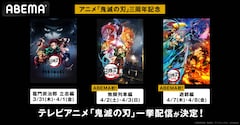 これは2019年4月にTVアニメ「『鬼滅の刃』竈門炭治郎 立志編」が放送されてから3周年を迎えることを記念したもの。「竈門炭治郎 立志編」を前半の第1話から第14話と、後半の第15話から第26話に分けて、3月31日と4月1日の2日間配信していく。4月2日と4月3日には「無限列車編」を、翌週4月7日と4月8日には「遊郭編」を配信。配信後から1週間は各エピソードを無料で楽しむことができる。それぞれ開始時刻はABEMAの配信ページなどで確認を。なお4月6日23時30分からは「竈門炭治郎 立志編」の同時視聴企画が行われる。