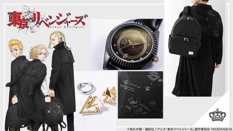 またバッグは内装に各キャラクターの印象的なモチーフをちりばめたデイバッグを用意。そしてイヤリングはタケミチモデルが四葉のクローバー、マイキーモデルはマイキーの愛機、ドラケンモデルはドラケンの辮髪をモチーフに、各キャラクターを表現している。購入者には描き下ろしイラストを使用したステッカーをプレゼントする。