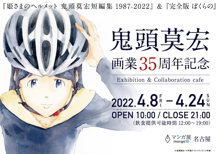 鬼頭莫宏の画業35周年を記念した展示イベント「鬼頭莫宏画業35周年記念『姫さまのヘルメット 鬼頭莫宏短編集1987-2022』&『完全版 ぼくらの』 Exhibition & Collaboration cafe」が、本日4月8日から24日まで愛知・マンガ展 名古屋で開催されている。