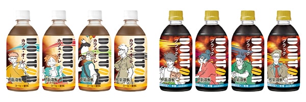 ラインナップされたのは、ドトールコーヒー監修の「ドトール カフェ・オ・レ」と「ドトール ブラック」のデザインボトル全8種類。パッケージはTVアニメ「呪術廻戦」1期1クール目のエンディングイラストが使用され、特定のボトル同士を並べると背景の1部がつながるデザインになっている。