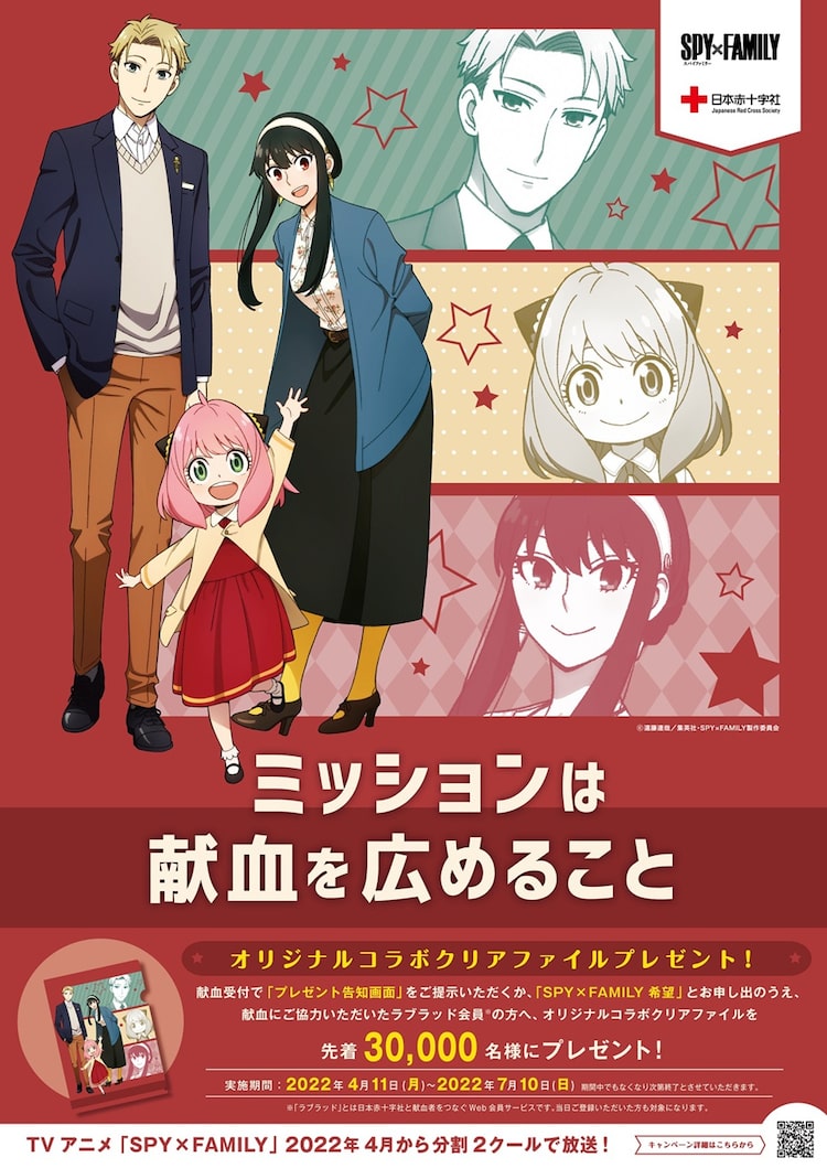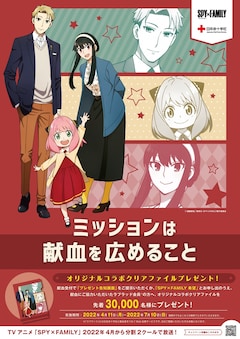 遠藤達哉原作によるTVアニメ「SPY×FAMILY」と日本赤十字社の献血コラボキャンペーンが、本日4月11日から7月10日まで全国の献血会場にて行われる。