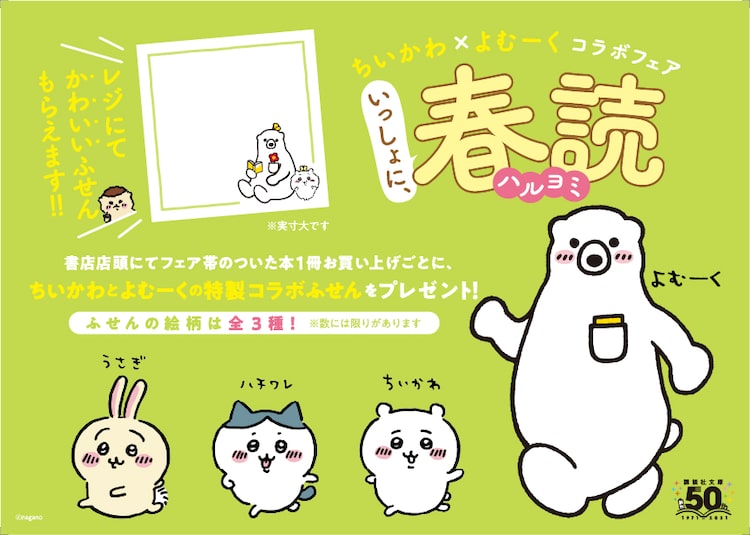 「講談社文庫創刊50周年 よむーく&ちいかわコラボフェア」では、講談社文庫の創刊50周年を機に誕生したオリジナルキャラクター・シロクマのよむーくと「ちいかわ」のイラストが、文庫本の帯や書店のポスターに登場。フェア対象書籍を購入した人に「特製コラボふせん」が配布される。フェアの対象書籍は「お仕事の本」「青春・友情の本」「たたかいの本」「SF・ミステリーの本」の4つのジャンルに分けられており、各ジャンルに合わせたイラストが用意された。フェアの参加書店リストは特設ページにて確認を。