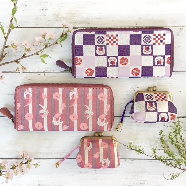 長財布は横20cm、高さ10cm、厚み2cmという大きさ。2カ所の札入れとファスナー付きの小銭入れ、大小合わせて12カ所のカードポケットを備えている。がまぐちは横9.5cm、高さ7cm、厚み3cmの手のひらサイズ。ワンポイントとして鈴の根付が付けられた。デザインは紫をベースにしたモダンな「格子柄」とピンク色が優しい印象の「縞柄」の2種類がお目見えしている。
